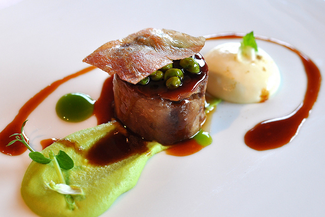 From the French – Timbale of apple and duck liver with vanilla oil.