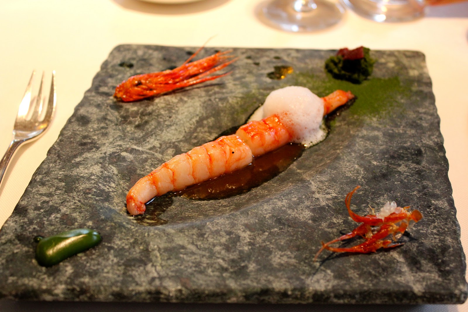 grilled prawn, head juice with seaweeds, seawater, sponge cake of plankton