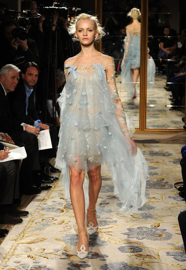Tribute to the eternal style created in the 80s by Gianni, the Donatella Versace collection imposed white studded with gold studs, on breathtakingly high plexiglas. The perfect house beauty prizewinners only imagined themselves surrounded by masseur, hairstylist, makeup artist,manicurist, and so obviously by a bodyguard. Teens from the world over who are not as wild are ready to fight over the Versace collection that H&M will launch in mid-November, this style here remains reserved for girls who refuse to get up for less than 8.000 Euro ($10.000). However we liked the play on plisses that sometimes over-decorated these outfits and especially the 1950s sea bottom prints in more refreshing faded shades.